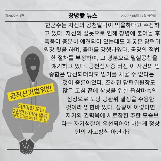 | ▲한정우 군수 후보의 공직선거법 위반 혐의를 보도한 창녕애뉴스 |