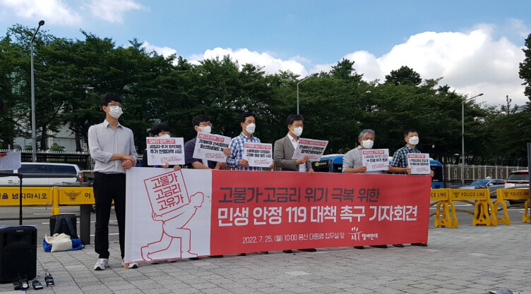 | ▲ 중소 자영업자들과 참여연대 등은 25일 용산 대통령 집무실 앞에서 고물가·고금리 위기 속 가계 부담 완화 등 민생 우선 정책을 펼쳐줄 것을 촉구했다. 이날 이들은 민생 안정 4대 분야 10개 정책 과제를 집무실에 전달했다. |