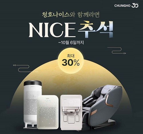 [소셜밸류=김완묵 기자] 청호나이스가 오는 10월 6일까지 추석맞이 제품 할인 프로모션을 진행한다고 22일 밝혔다.