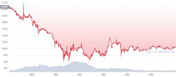 코인마켓캡에 따르면 가상화폐 C2X의 가격은 지난 10일 기준 2100∼2300원대에서 11∼12일 한때 500∼600원대까지 떨어졌다가 16일 오전에는 1000원 선에 머무르고 있다. C2X 측은 루나·테라 사태가 확산하자 지난 13일 "다른 메인넷으로 전환하기로 했다"고 공지했다.