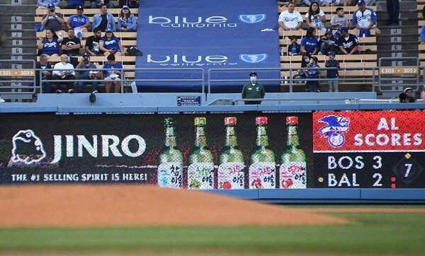 | ▲하이트진로, LA다저스와 스폰서십 체결로 구장 내 광고를 설치해 홍보하고 있다./사진=하이트진로 제공 |