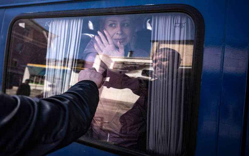 | ▲4월 9일 우크라이나 크라마토르스크에서 한 여성이 피난길에 버스에서 남편에게 작별인사/Fadel Senna/AFP/CNN |