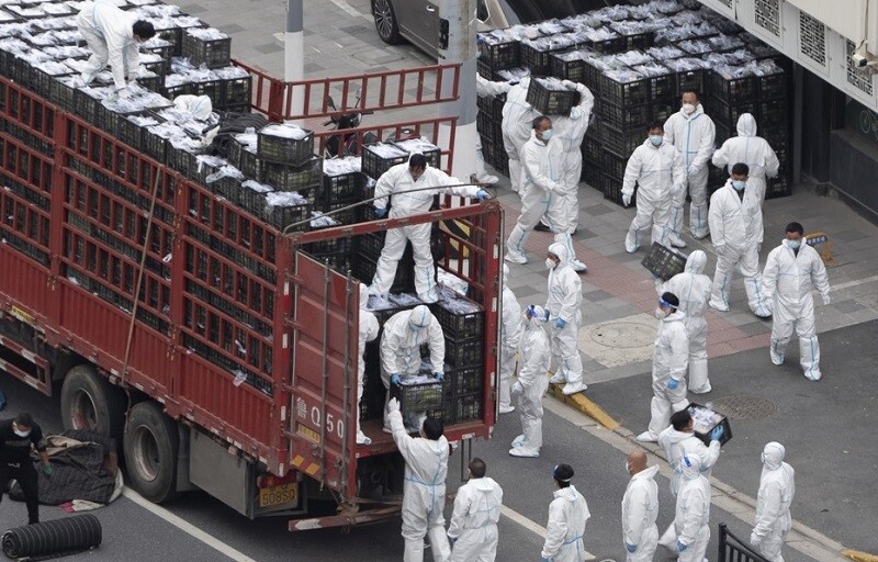 | ▲코로나19 봉쇄 기간이 연장된 중국 상하이에서 5일 보호복을 입은 사람들이 격리된 주민들에게 전달할 식료품을 트럭에서 내리고 있다. 거주 인구가 약 2600만 명인 상하이시는 신규 감염자가 폭증해 애초 해제일로 잡았던 이날 이후로도 도시봉쇄가 계속된다고 밝혔다./사진=연합뉴스 제공 |