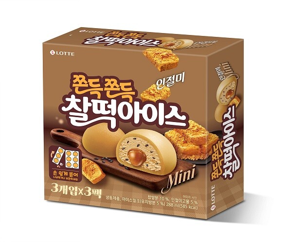 ‘찰떡아이스 인절미’는 떡, 아이스믹스, 시럽의 3중 구조로 되어 있다. 쫄깃한 찰떡 안에 인절미 고물, 검은깨 등이 섞인 아이스크림이 들어 있으며 그 안에 콩 맛 시럽을 첨가해 리얼한 인절미 맛을 느낄 수 있도록 했다.