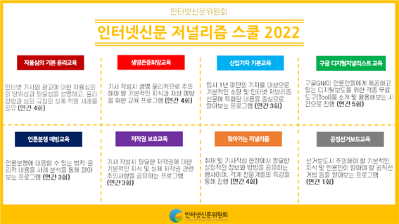 인신위가 발표한 ‘인터넷신문 저널리즘 스쿨 2022’는 개인미디어의 범람 및 취재윤리의 의식부족에 따른 사회적 문제가 발생하는 상황을 감안해 언론인으로서의 기본적인 윤리교육과 실제 취재현장에서 유용한 직무교육을 다양하게 제공할 예정이다.