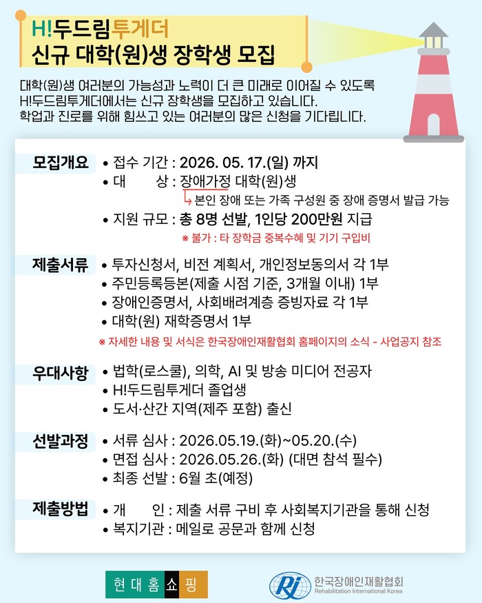 [소셜밸류=박완규 기자] 한국장애인재활협회와 현대홈쇼핑은 저소득 장애가정 청년들의 교육 기회 확대와 미래 역량 강화를 위해 ‘H!두드림투게더 대학(원)생 장학생’을 모집한다.