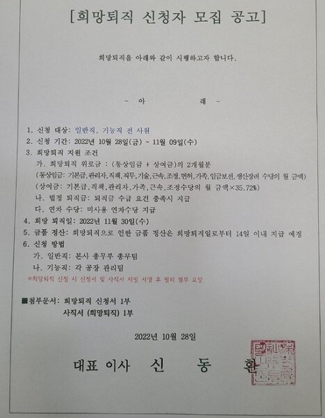 하지만 2차 교섭을 31일에 하기로 하고는 돌연 희망 퇴직을 권고하는 공고가 붙었다. 희망 퇴직일은 11월 30일까지다.