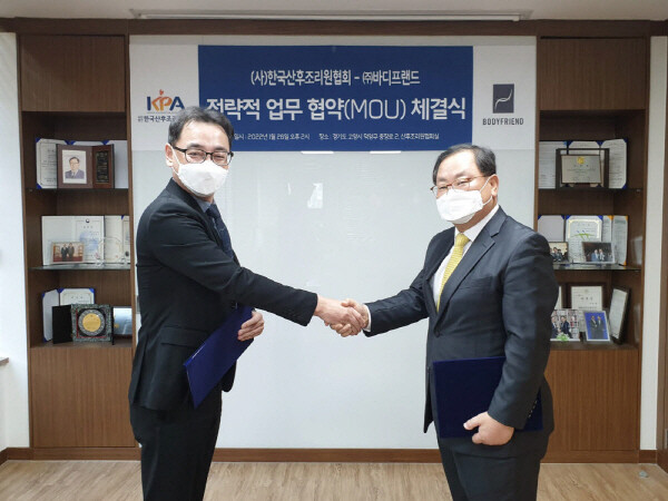 ▲지난달 26일 한국산후조리원협회실에서 진행된 (사)한국한후조리원협회와 ㈜라클라우드 전략적 업무 협약식에서 바디프랜드 영업총괄본부 오윤성 본부장(왼)과 한국산후조리원협회 김형식회장(오)/사진=바디프랜드 제공 |