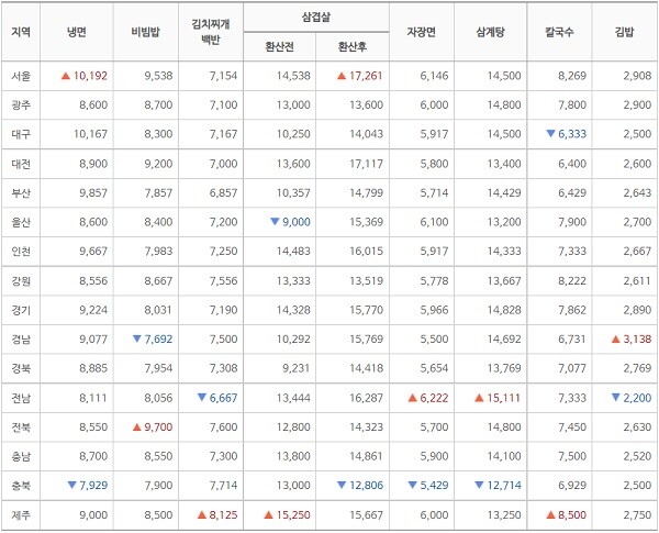 이 외에도 짜장면, 칼국수, 삼겹살, 등이 전반적으로 물가 상승으로 인하여 금액 변동이 생겼다.
