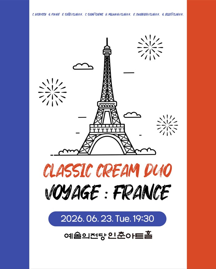 오는 6월 23일 오후 7시 30분 예술의전당 인춘아트홀에서 열리는 ‘클래식크림듀오 보야지 프랑스’는 한 대의 피아노와 네 손이 만들어내는 섬세하고 풍부한 하모니로, 청중을 프랑스의 풍경 속으로 이끄는 공연이다.