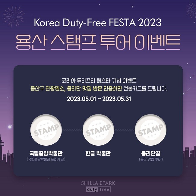 신라아이파크면세점이 위치한 용산구의 관광 활성화를 위해 ‘용산 스탬프 투어’ 이벤트도 진행한다. 행사 기간 국립중앙박물관, 한글박물관 등 용산구의 관광 명소와 용산역 상권 ‘용리단길’ 맛집 방문을 한 고객 대상으로 선불카드를 추가 증정한다. 박물관에서 촬영한 사진과 용리단길에 위치한 식당 영수증을 신라아이파크면세점 멤버십 데스크에 제시하면 최대 1만5천원의 선불카드를 받을 수 있다.