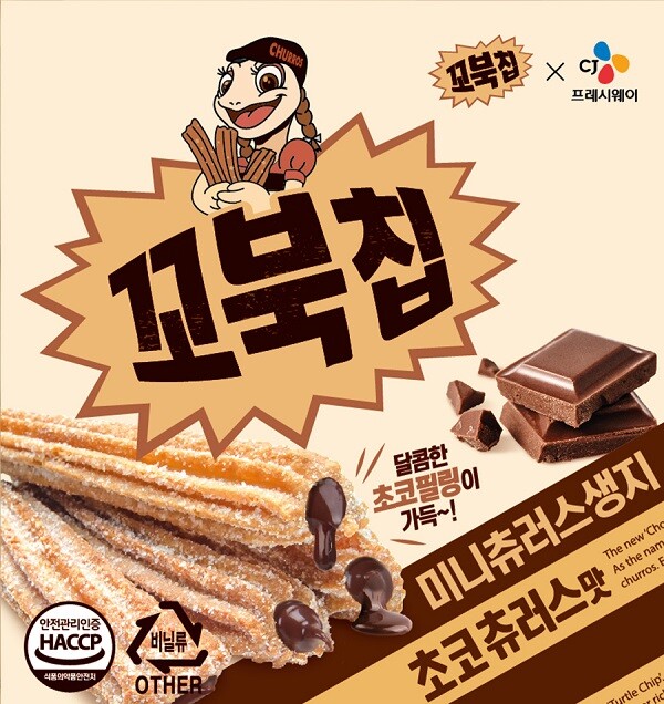 | ▲CJ프레시웨이가 오리온 꼬북칩과 콜라보한 ‘꼬북칩 초코츄러스맛 미니츄러스생지’를 선보인다./사진=CJ프레시웨이 제공 |