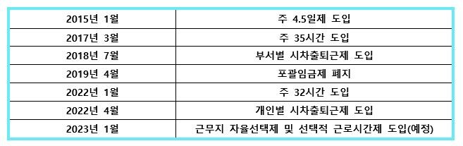 근무 장소뿐 아니라 근무 시간도 자율 선택으로 전환된다. 올 초 도입된 '개인별 시차 출퇴근제'에서 더 나아가 내년부터는 유연 근무제 일환인 '선택적 근로 시간제'를 도입한다는 것이다. 이에 따르면 기존의 하루 7시간(월요일은 4시간), 주 32시간 기준에서 월 단위 총 근무 시간 내에서 개인의 업무 스케줄과 컨디션 등에 따라 자율적으로 업무 시간을 분배할 수 있게 될 예정이다. 일례로 어떤 주에는 20시간만 근무하고 좀 더 업무에 몰두가 필요한 주에는 50시간을 근무할 수 있는 것이다.