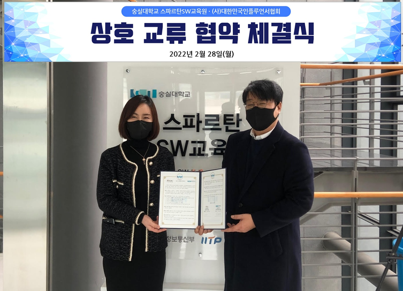 | ▲(사)대한민국인플루언서협회 김현경 회장(좌)과 숭실대학교 스파르탄 SW교육원 신용태 원장(우)이 업무협약 체결 후 기념촬영을 하고 있다. |