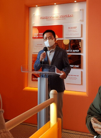 | ▲임금옥 bhc그룹 대표가 31일 슈퍼두퍼 글로벌 1호점인 강남점 11월 1일 공식 개점을 앞두고 미국 샌프란시스코 대표 수제 버거 슈퍼두퍼를 소개하고 있다. /사진=이호영 기자. |