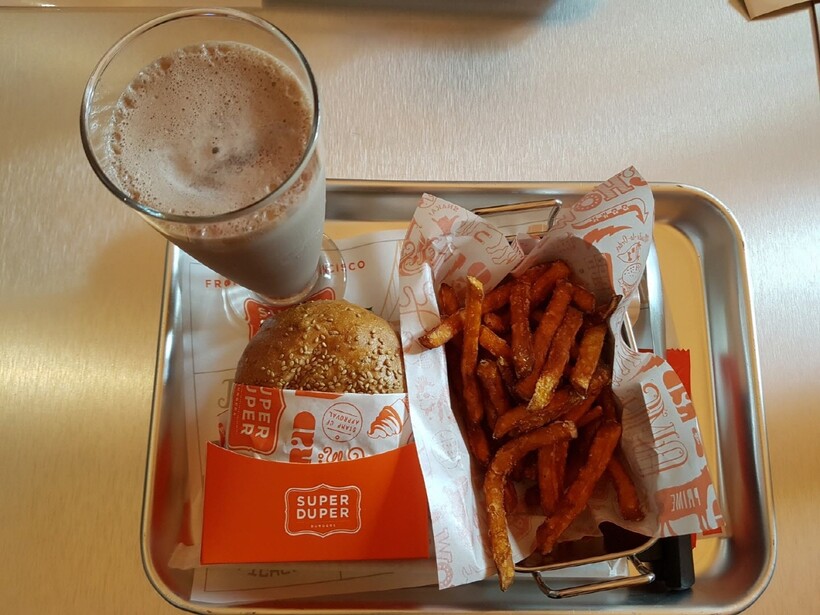 | ▲슈퍼두퍼 슈퍼 싱글 버거와 사이드 메뉴 스위트 포테이토 프라이즈, 초코 쉐이크 모습. /사진=이호영 기자. |
