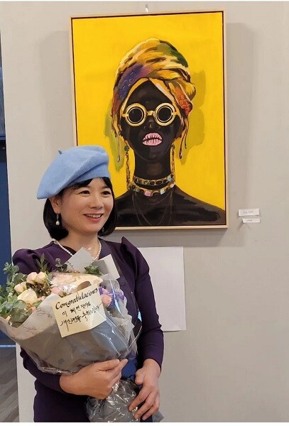 | ▲이혜연 작가가 자신의 그림 앞에서 기념사진을 찍고 있다. |