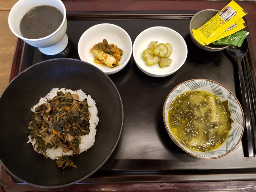 | ▲흑임자죽은 자극적이지 않고 고소한 검정깨 원재료 풍미가 그대로 살아 있다. 산채나물비빔밥은 취나물과 곤드레나물, 고사리, 해방풀나물을 영양 가득한 한 그릇 밥으로 담아냈다. 취향에 따라 들기름, 된장을 넣으면 향미가 더 진해진다. |