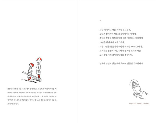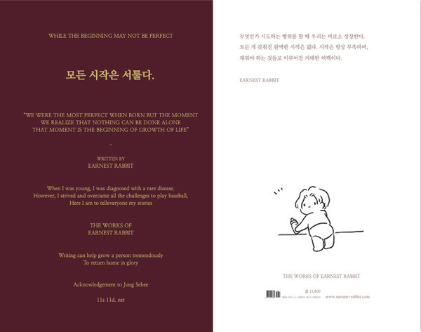 "안녕하세요. 독립출판물을 제작하는 어니스트 레빗입니다. 이름에서도 느껴지시겠지만 성실히 하루를 써 내려가는 창작자가 되고 싶어 붙여진 이름입니다. 87년 토끼띠로 래빗이라는 이름을 붙였는데, 상표등록표 과정에서 레빗으로 올라가게 되어 영문은 Earnest Rabbit 한글은 어니스트 레빗으로 활동하고 있습니다. 역시 제목에서 느껴지시겠지만 이렇게 서툽니다."