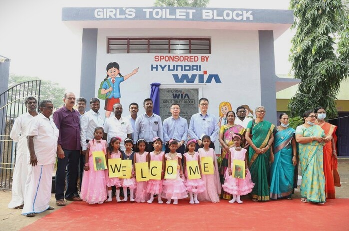 | ▲현대위아 임직원들이 인도 센가두 지역에서 열린 ‘여성 화장실’ 준공 행사에서 현지 주민 및 여학생들의 환영을 받고 있다./사진=현대자동차그룹 제공 |