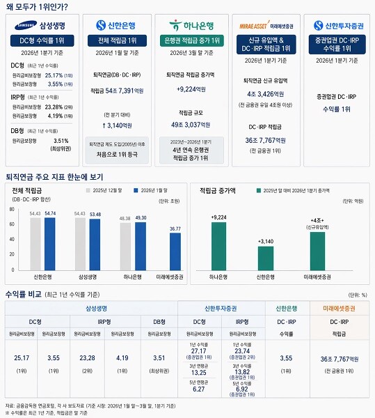 이 거대한 시장에서 금융사들이 모두 ‘1위’를 외치면서 소비자의 선택하는데 혼란을 가중하고 있다는 지적이 제기된다. 삼성생명은 DC형 1년 수익률 1위를, 신한은행은 전체 적립금 1위를, 하나은행은 은행권 적립금 증가액 1위를, 미래에셋증권은 1분기 신규 유입액과 DC·IRP 적립금 1위를, 신한투자증권은 증권업권 DC·IRP 수익률 1위를 각각 내세우고 있다.