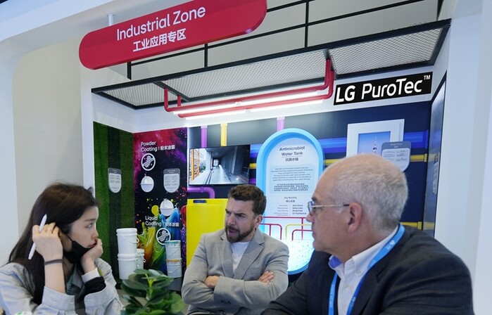 | ▲LG전자가 21일부터 중국 상하이에서 열리고 있는 세계 3대 산업 소재 전시회 '차이나플라스'에 참가해 역대 최대 크기의 부스를 조성하고, 항균 기능성 신소재 퓨로텍의 효용성을 다양한 산업군의 B2B 고객에게 소개했다./사진=LG전자 제공 |